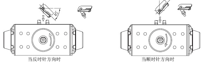 3,把執行機構軸的回轉位置對準起始位置,即開度的0%位置。當執行機構是利用彈簧的單作用氣缸時,如果不輸入氣源壓力,則氣缸軸始終返回到起始點,因此很容易確認。當雙作用氣缸時,請參照氣缸說明書,確認是順時針旋轉還是逆時針旋轉,或輸入空壓時氣缸軸的回轉方向來判斷。
